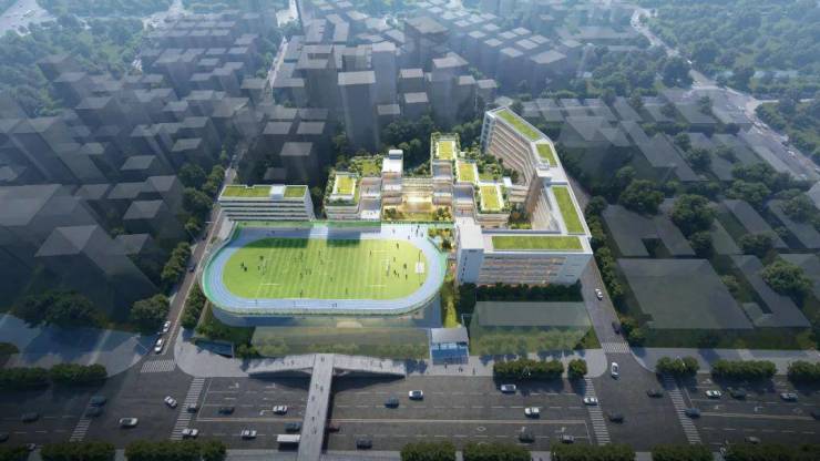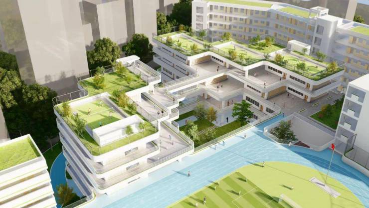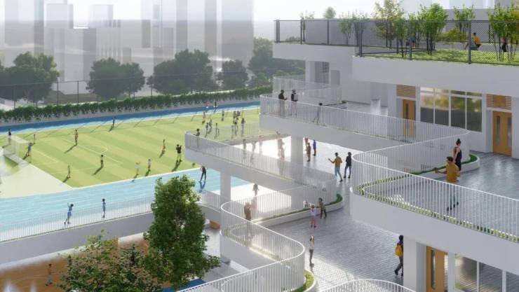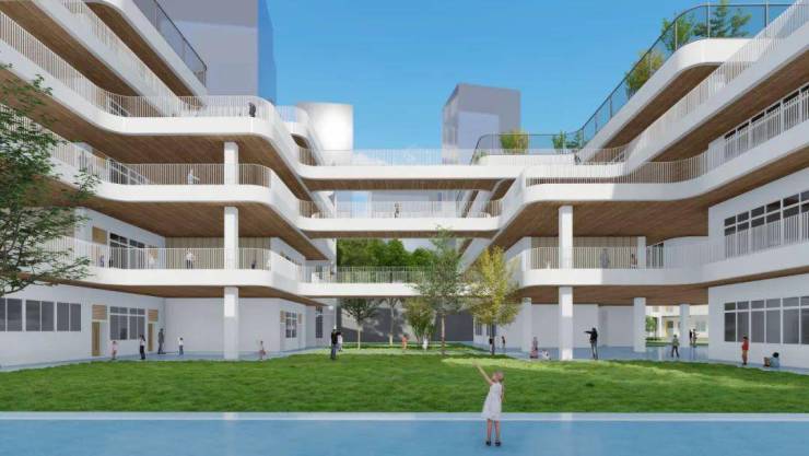 通透开放的立体田园搭配错落有致的活动平台,活力满满;退台式的教学单元远离城市干扰,景色怡人。空间规划上避让城中村,并设置架空无风雨连廊,联系原有校舍,形成大平层校园平层。通过建筑形体的错落较大化共享教学庭院空间,景观视野较大化,打造通达高效、丰富多元的校园空间体验。