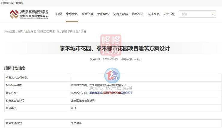 近日,深圳公共资源交易中心发布招标项目计划,将在2024年2月12日到2024年4月12日期间,对泰禾城市花园、泰禾都市花园项目建筑方案设计进行招标。