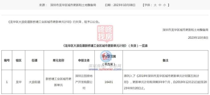 新桥塘工业区城市更新单元位于龙华大浪街道,原列入了《2019年深圳市龙华区城市更新单元计划第五批计划》,更新单元计划有效期3年9个月,自2019年12月21日起至2023年9月20日止,已失效,现予以公告。