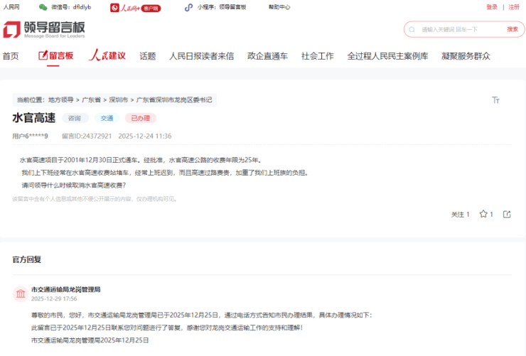 在2025年12月24日与30日,连续有两位市民在人民网“领导留言板”发声,询问水官高速取消收费的具体时间,其中一位市民直言收费站拥堵常致上班迟到,且通行费加重了通勤负担。