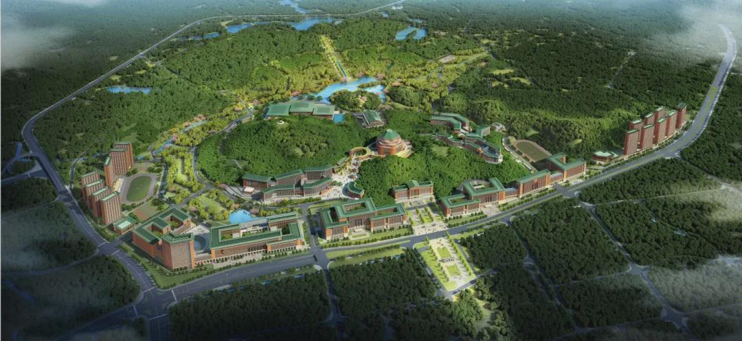 用地一山矗立,七丘拱卫,新陂头河横贯其中,形成山水相融的自然格局。设计提出“山•水•礼•学”的校园规划结构。采用集约化、高密度的建设策略,控制建设用地规模,保护生态林地,预留发展用地。
