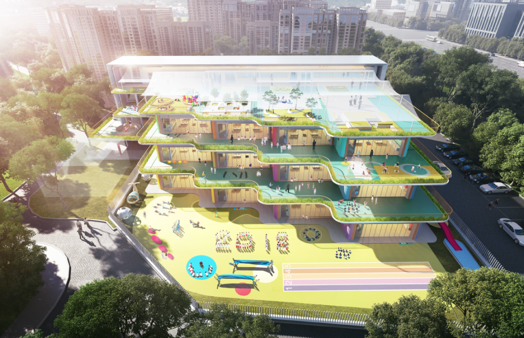 项目以“层层退台的立体田园”为设计理念,选用绿色环保材料,首层到屋顶花园由绿及蓝依次变化,使每层活动场所均有自己的颜色特性,室内以木色和白色为主调,空间通透明亮,为园方使用预留弹性。