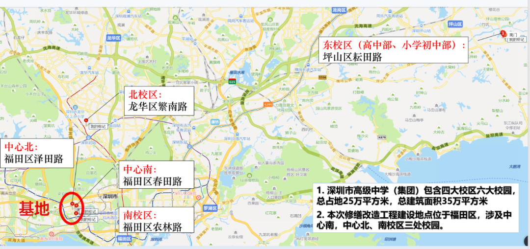 深圳市高级中学校园修缮改造工程项目位于福田区,涉及中心南,中心北、南校区三处校园。主要改造内容为: 建筑外墙砖修补、屋面琉璃瓦修补、建筑内过道修缮改造、食堂改造、文体楼改造、卫生间改造、校内供电系统及供水管网改造等。