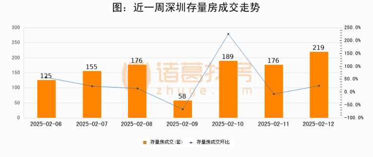 从存量房来看,2025年02月12日深圳存量房单日成交219套,比昨日增加43套,环比上涨24.4%。从近一周存量房成交来看,深圳存量房日均成交套数为156套,02月12日单日成交219套,高于近一周平均水平40.4%。