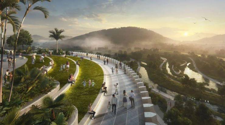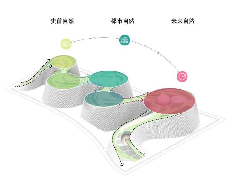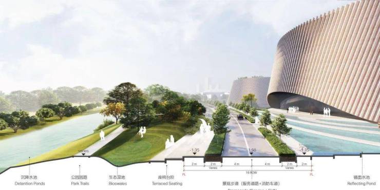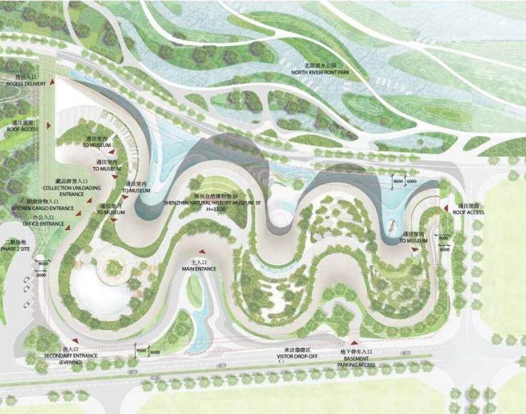毗邻的滨河公园是博物馆整体愿景的组成部分。它既反映了自然历史博物馆的概念叙事,也促进了与博物馆屋顶公园的衔接和引流,创造出了一个可持续景观,将坪山河的自然系统、流向和功能突出呈现。