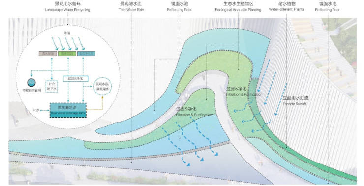 在宏观层面上,这种精密的可持续雨水管理系统也成为了公园及北向河流的自然延伸。雨水汇入自然湿地和滞洪池,让岸线回归自然状态,与周围环境充分融合,进一步抬升了自然博物馆的设计愿景。