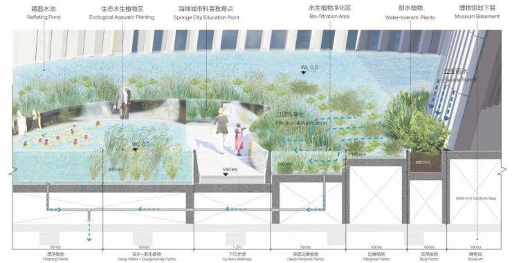 此外,考虑到本地候鸟的多样性,方案优选适宜候鸟繁衍栖息的植被。为了搭建一个可持续的自然生态系统,本土开花植物和功能性水生植物也被引入其中,以吸引多样化的野生动物,保持健康的水循环。该自然生态系统有助于进一步整合博物馆和周围的自然生态。