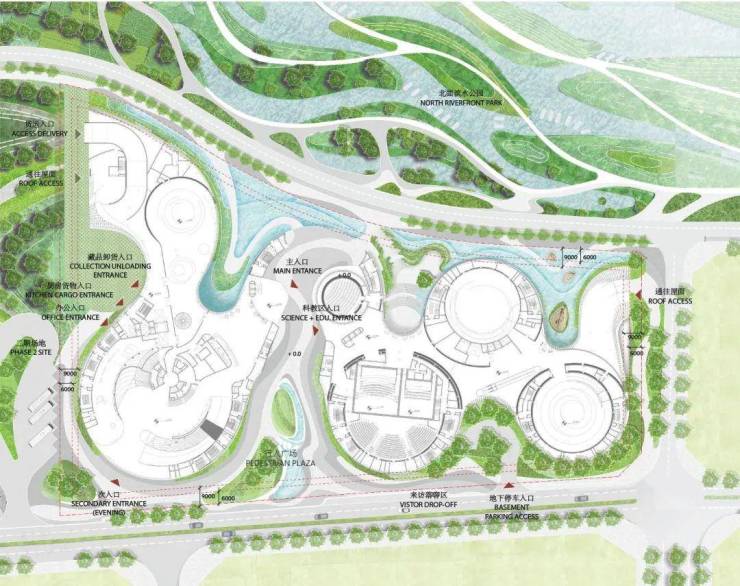 场地北侧的水体是连接景观与博物馆、公园和北部河流的重要纽带。水体中的三个水流“漩涡”,为参观者提供了形象的视觉体验,进一步强化了“河流”的整体设计概念。