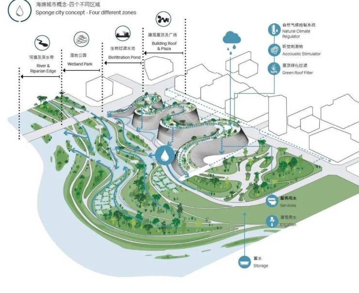 以海绵城市为例,设计搭建了一个可持续的韧性框架,通过四个相互连接的区域,收集和再利用雨水,减轻洪水的影响,减少对传统基础设施的依赖,并补充地下水含水层。