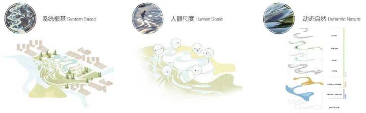 河流像景观一样,经历着生生不息的演化、更替和发展,永不停歇。河流掌管自然的奥义,讲述生命的故事,解释过去,塑造现在,预言未来。景观规划从中汲取灵感,设计语言由此展开,旨在将场地和地区内的丰富自然生态,以鲜活、形象、深入浅出的方式展现给受众。