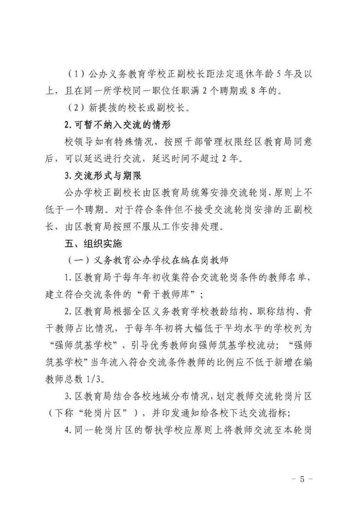 方案表示,需要轮岗的教师和校长,包括:公办义务教育学校教师距法定退休年龄5年及以上,且在同一所学校(不含分校区,下同)教师岗位连续任教满9年;公办义务教育学校正副校长距法定退休年龄5年及以上,且在同一所学校同一职位任职满2个聘期或8年的。
