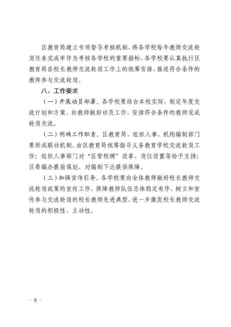 (4)公民办帮扶交流。教师到本校对口的民办学校开展交流任教,且经区教育局考核合格的,视同交流轮岗经历。