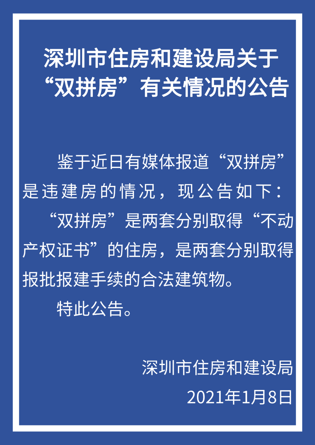 1月8日晚,深圳市住房和建设局发布关于“双拼房”有关情况的公告;