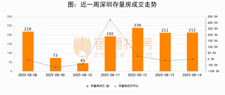 从存量房来看,2025年08月14日深圳存量房单日成交212套,比昨日增加1套,环比上涨0.5%。从近一周存量房成交来看,深圳存量房日均成交套数为170套,08月14日单日成交212套,高于近一周平均水平24.7%。