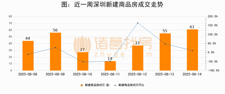 根据深圳市住房和城乡建设局数据显示,2025年08月14日深圳新建商品房成交61套,较昨日增加6套,环比上涨10.9%