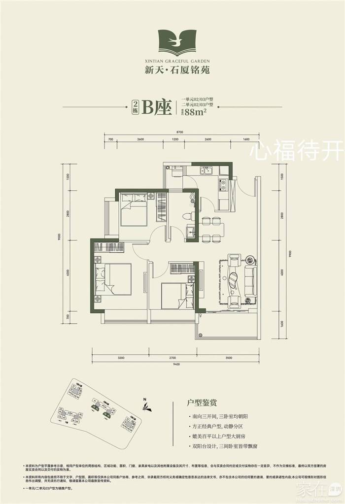 2栋B座一单元02、03户型、2栋B座二单元02、03户型:面积约为88㎡的3房2厅2卫;