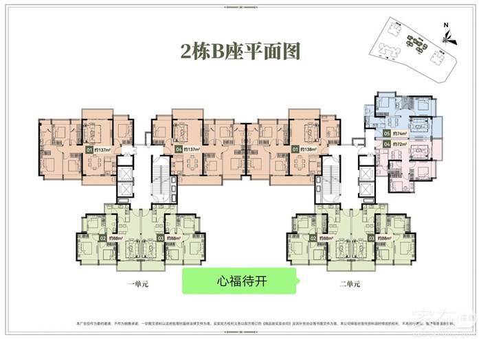 2栋B座一单元01、04户型、2栋B座二单元01户型:面积约为137-138㎡的4房2厅2卫;