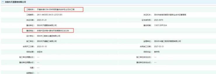 根据公示,天健赤湾K104-0049项目建设单位为深圳市天璟置地有限公司,建设规模约13657.28㎡,项目基坑支护与土石方工程合同开工时间为2025年1月10日合同竣工日期为2027年3月31日。