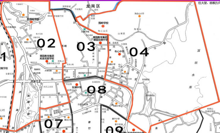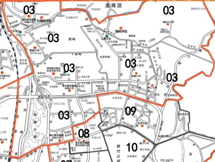 03大学区由华丽小学、木棉岭学校、翠茵学校、围岭学校、布心小学、东晓小学、淘金山小学、东昌小学、水田小学和松泉实验学校小学部组成,保留现03大学区范围不变。