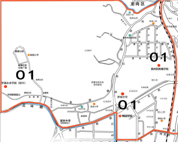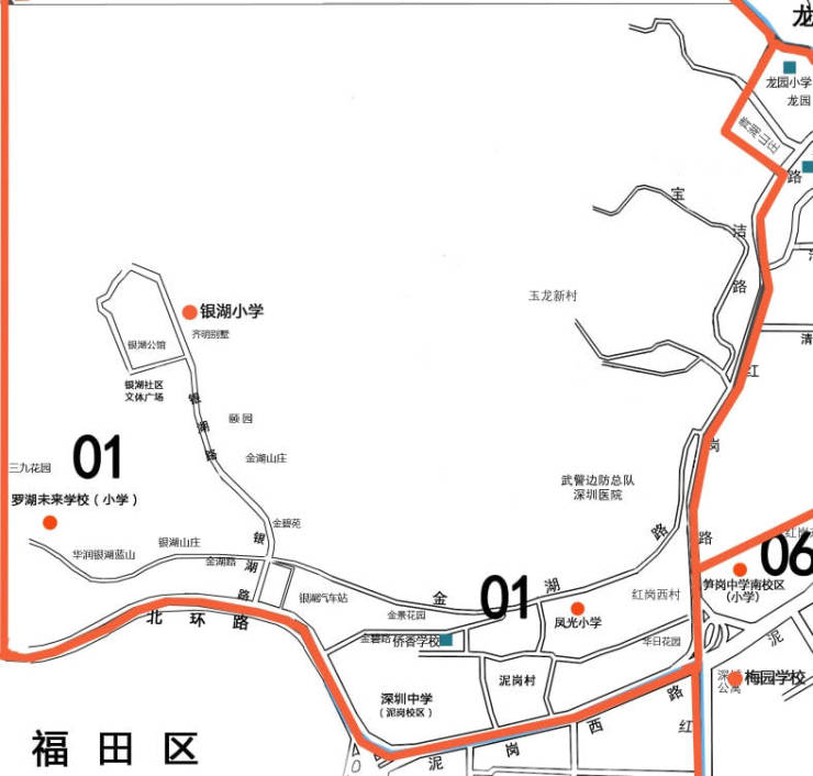 01大学区由罗湖未来学校小学部、凤光小学、银湖小学组成,保留现01大学区范围不变。
