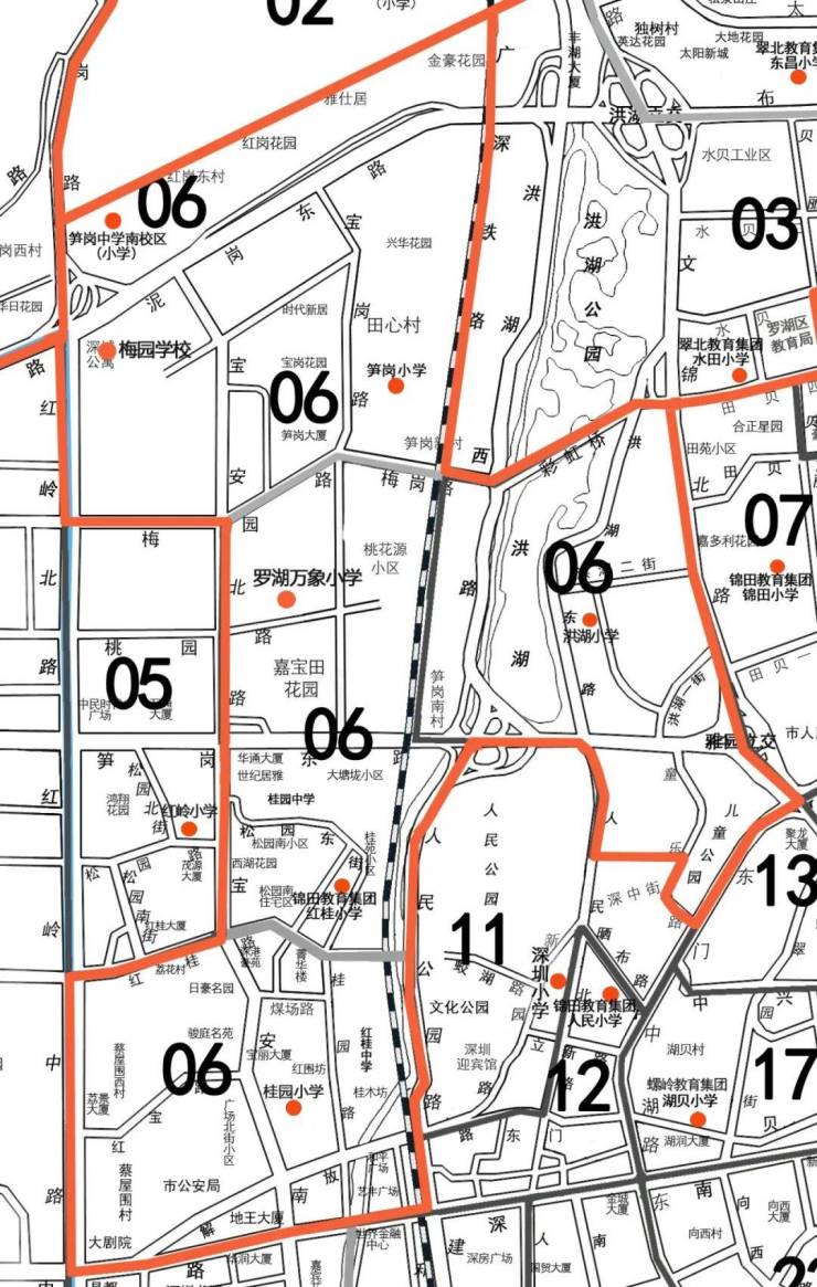 06大学区由笋岗小学、笋岗中学小学部、桂园小学、红桂小学、罗湖万象小学、罗湖梅园学校、洪湖小学组成。