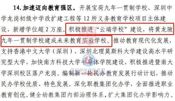 在今年3月1日公布的《龙岗区2022年国民经济和社会发展计划执行情况与2023年计划》中提到,开展宝荷九年一贯制学校、深圳中 学龙岗初级中学改扩建工程等 12 所义务教育学校项目主体建 设,新增学位超 2 万座。积极推进“云端学校”建设,将黄龙陂 九年一贯制学校建成未来教育实验学校。