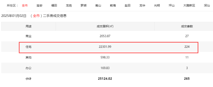 2025年1月2日二手房住宅网签224套。其中,宝安22套;福田36套;龙岗51套;罗湖31套;南山39套;盐田4套;龙华29套;坪山6套;光明4套;大鹏2套。