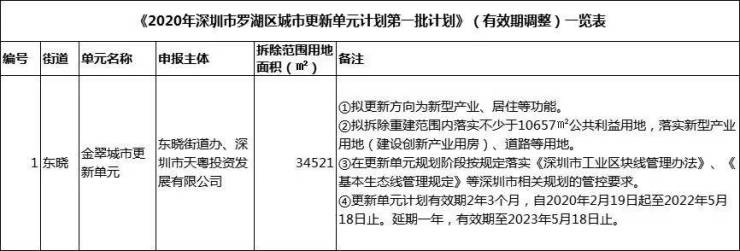 5月20日,罗湖区发布关于《2020年深圳市罗湖区城市更新单元计划排名前列批计划》有效期调整的公告,东晓街道金翠城市更新单元有效期延期一年。