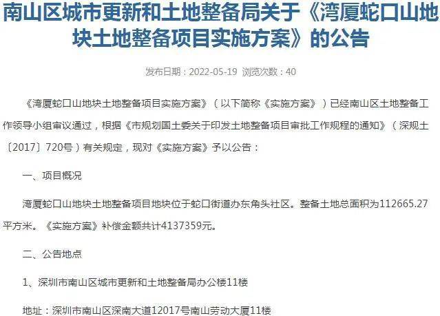 2022年5月19日,南山区发布湾厦蛇口山地块土地整备项目实施方案的公告。