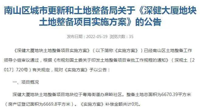 2022年5月19日,南山区发布深健大厦地块土地整备项目实施方案的公告。