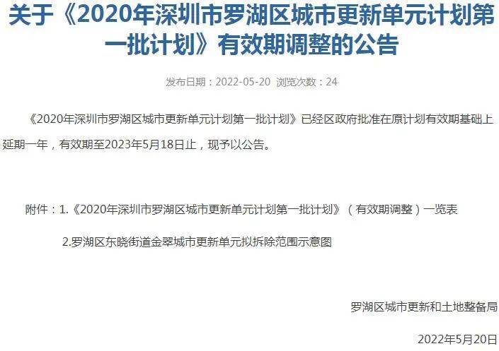 2022年5月20日,罗湖区发布《2020年深圳市罗湖区城市更新单元计划排名前列批计划》有效期调整的公告。
