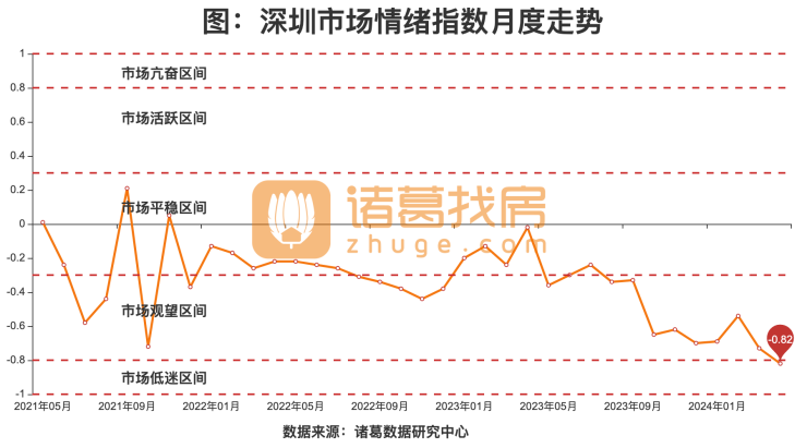 根据诸葛找房数据研究中心监测数据显示,2024年04月,深圳市场情绪指数为-0.82,较上月下降0.09,位于市场低迷区间。