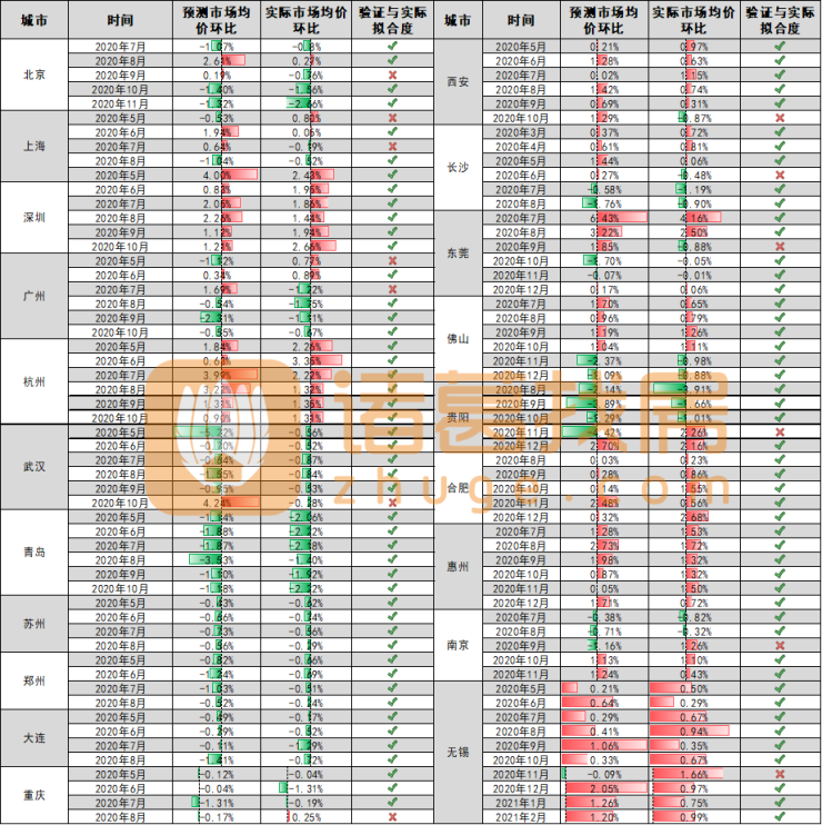 为了验证预测模型的准确性,诸葛找房数据研究中心特选取20个重点城市在2020年及2021年部分月份数据,对比实际市场均价环比与预测市场均价环比的拟合度,根据验证显示,市场情绪指数模型预测房价的整体准确度达到88.2%,有45%的城市预测准确度高达90%以上,85%的城市预测准确度超80%。