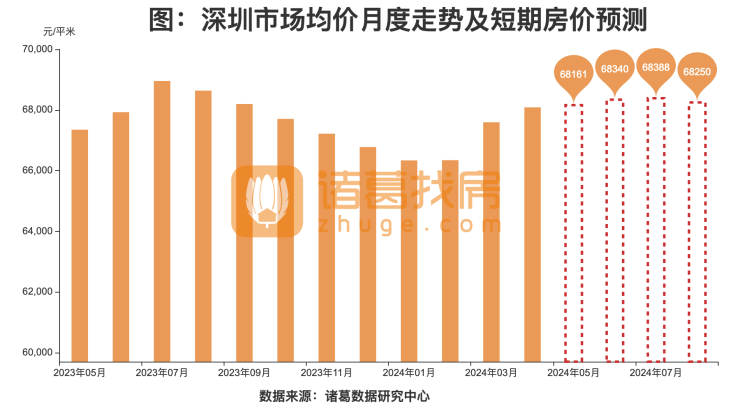 从房价水平来看,4月深圳市场均价为68088元/㎡,环比上升0.73%,同比上升1.51%。根据情绪指数模型,预测深圳未来短期内价格上行,未来4个月价格上升至68250元/㎡,累计上涨0.24%。