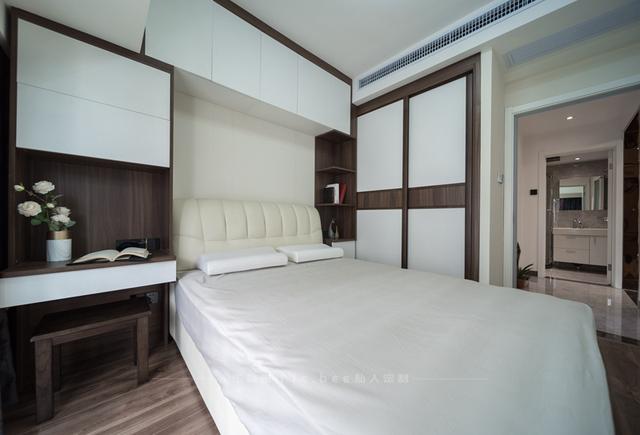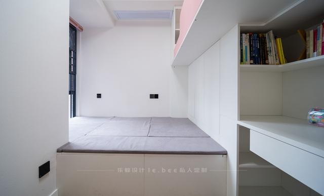 榻榻米是异型次卧的较佳搭档,它用超强的储物实力在这里称霸为王。细心的男主考虑到长辈亲朋偶尔会来家里小住,但新家的卧室数却没有上门的亲朋们那般热情。“小机智”莫工选择在次卧设置错开式上下铺,榻榻米是其一,另一个床铺则腼腆地藏在书桌上方,既不影响卧室的活动空间,又巧妙避开无处留宿这一尴尬。