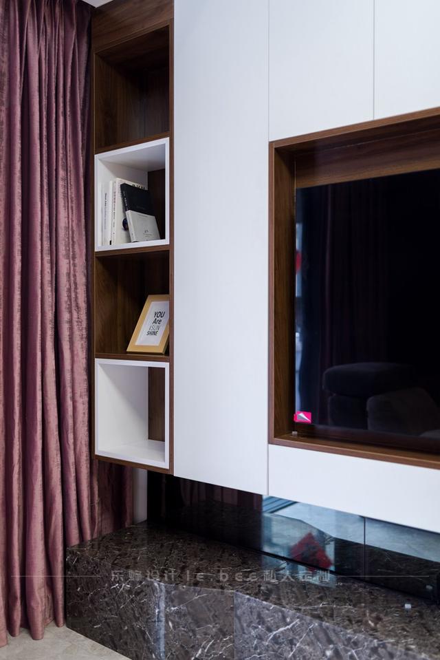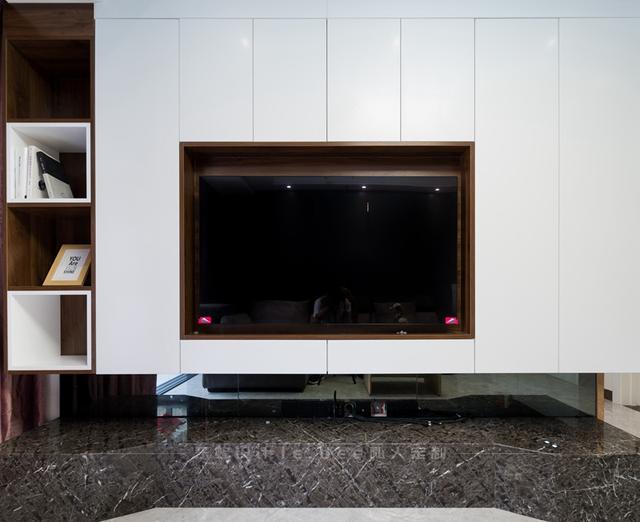 将电视背景墙与储物柜融为一体,给未来的家庭日杂预留足够的存放空间,柜体的白与木色组合,稳重而不过于醇厚,它们和电视机显示屏在立面相融相生,破解出单调背景的动感密码。
