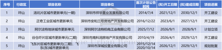 坪山区共5个项目入选。其中,有1个项目计划立项,1个项目取得规划批复,3个项目开工建设。