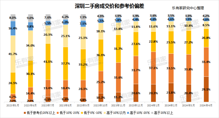 乐有家研究中心数据显示,4月成交的二手房源里,低于参考价成交的占比再次上涨,从3月的81.4%上涨至83.3%。