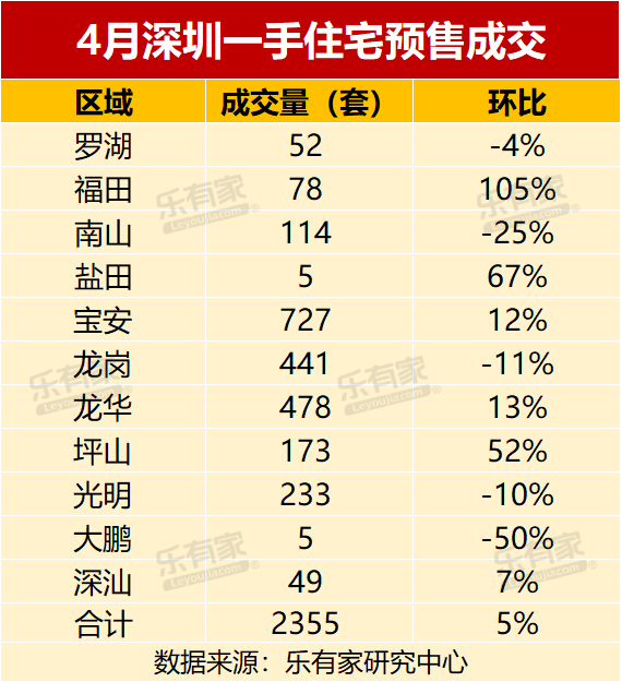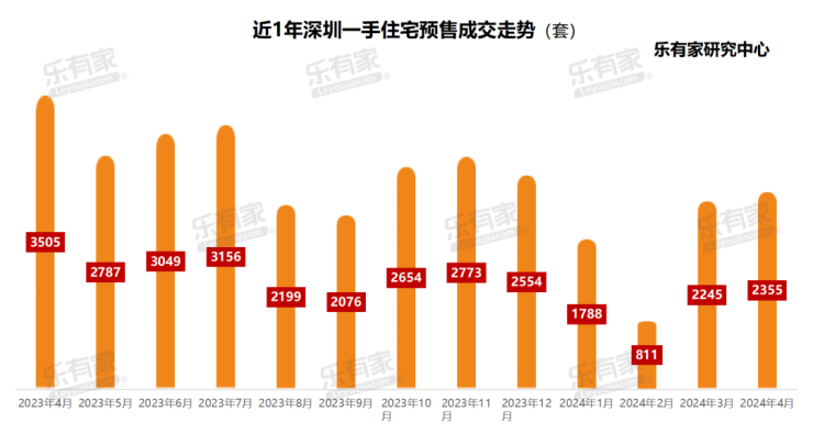 4月深圳一手住宅预售成交2355套,环比上涨5%,但同比下跌33%。这一交易量在过去1年里并不算亮眼表现。