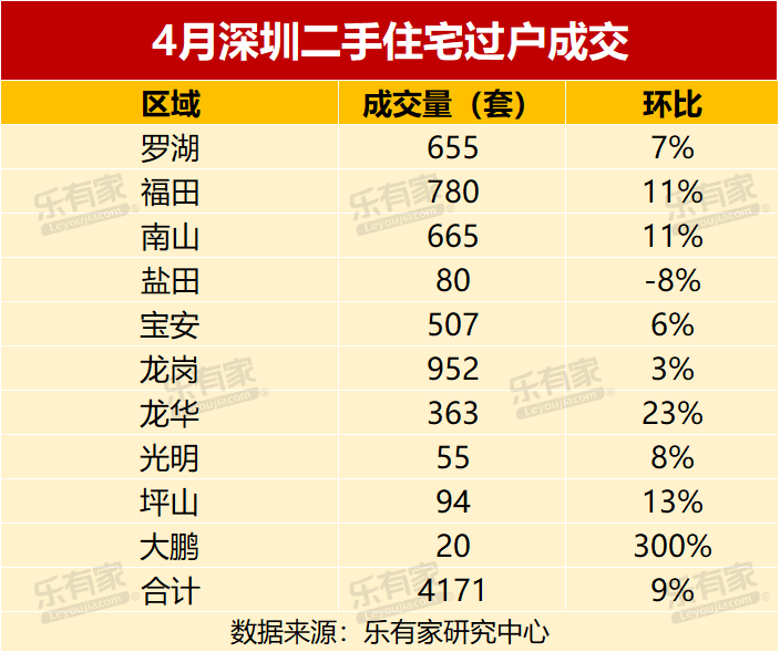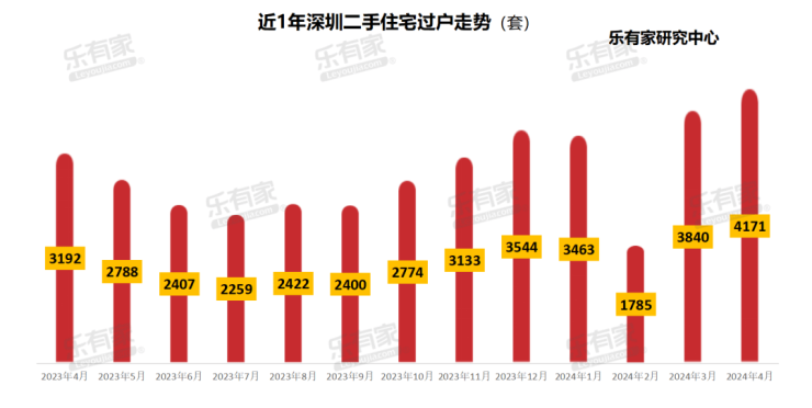 另一个关于二手房的数据,房地产信息平台的数据显示,4月深圳二手住宅过户量4171套,环比上涨9%,同比上涨31%。2-3月的市场成交陆续在4-5月过户,因此过户数据表现较佳。