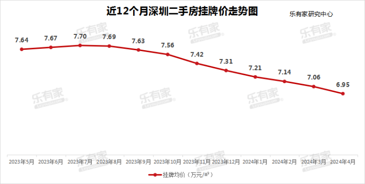 业主报价在4月继续下滑,进入6字头。4月乐有家网最新二手房挂牌均价为6.95万元/㎡,一年时间跌幅9%。