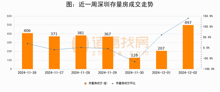 从存量房来看,2024年12月02日深圳存量房单日成交497套,比昨日增加290套,环比上涨140.1%。从近一周存量房成交来看,深圳存量房日均成交套数为336套,12月02日单日成交497套,高于近一周平均水平47.9%。
