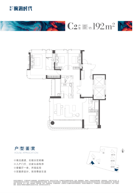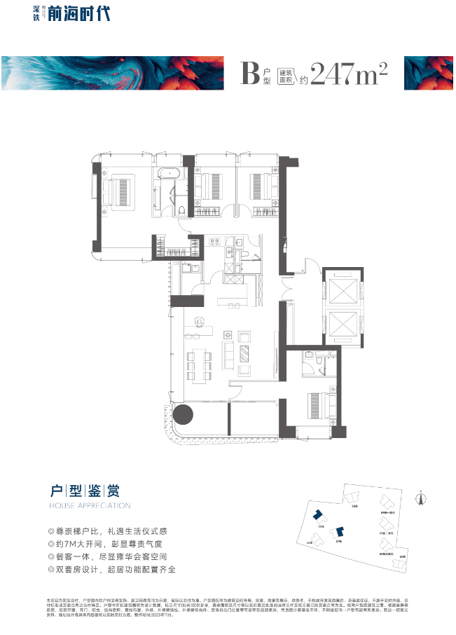 主推产品户型图如下,主打满分奢阔舒居。深铁前海时代尊府小区为纯粹大户型产品,小区业主圈层也比较纯粹。