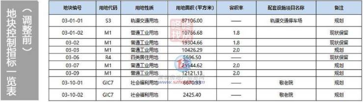 03-01-01地块规划用地性质为轨道交通用地(S3),用地面积87106.00平方米,配套设施为轨道交通停车场,备注为“规划”;03-01-02地块规划用地性质为普通工业用地(M1),用地面积10766.68平方米,容积率1.8,备注为“现状保留”;