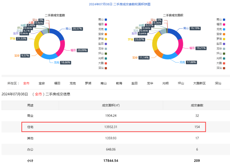 2024年7月8日二手房住宅网签154套。宝安15套;福田28套;龙岗29套;罗湖33套;南山32套;盐田2套;龙华11套;光明1套;坪山2套;大鹏1套。