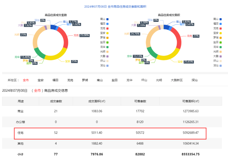 2024年7月8日新房住宅共网签52套。宝安13套;福田1套;龙岗12套;罗湖0套;南山3套;盐田0套;龙华7套;坪山2套;光明13套;大鹏1套;深汕0套。