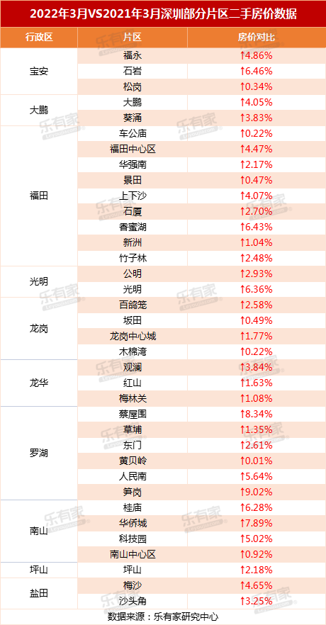价格方面,2021年3月到2022年3月,深圳这些片区二手房价大范围上涨。罗湖的笋岗和蔡屋围二手涨幅较大!豪宅片区,华侨城和香蜜湖涨幅也不少。