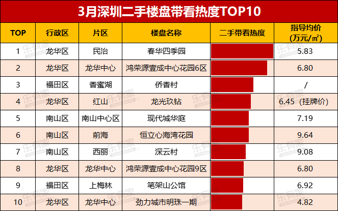 现阶段,深圳二手带看量已经回暖,3月深圳二手楼市客户看房量环比仍保持正增长状态。从带看热点楼盘分布来看,福田、南山、龙华仍是深圳二手楼市主战场,其中龙华民治的春华四季园,和龙华中心的鸿荣源壹成中心花园6区分别位居前二,近期转红本的侨香村也受到了广泛关注。