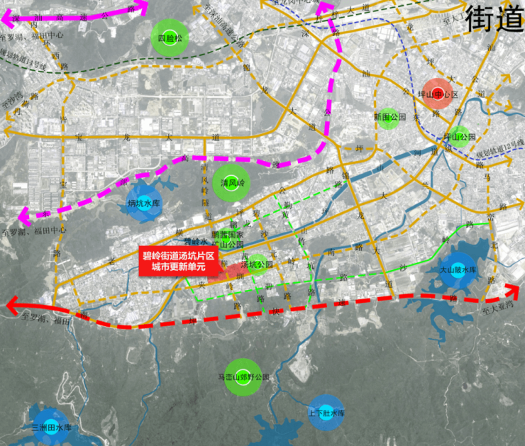 坪山碧玲片区以打造碧湖文化生态城的概念出圈,在近年来陆续有深圳国际影视城、华润旧改、龙光旧改、碧桂园旧改、坪山高中园等项目落地开花,形成“旧改连城”的整体开发格局,为“坪山西大门”的形象树立打下了较好的基础。