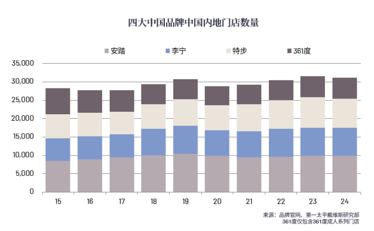 从整体来看,内资四大运动品牌(安踏、李宁、特步、361度)的门店数量在2020年后呈现积极扩张趋势,在疫情影响下显示出极强的市场韧性。而随着四大品牌门店总数在2023年超过2019年,达历史新高, 2024年的整体扩张略有收敛,门店总数同比微跌0.9%。成熟运动品牌在一二线城市的门店布局已接近饱和,优质商圈和核心地段资源有限;而下沉市场消费能力、品牌认知度与一二线城市存在差距,需谨慎评估投入产出比。因此主要通过专注单店效益提升,优化现有网络,提升门店质量。